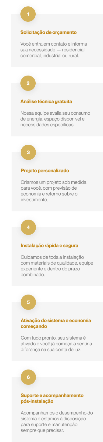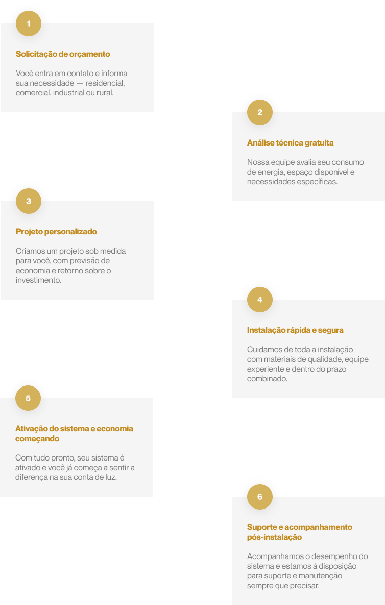 Somos uma empresa especializada em energia solar, com equipe técnica qualificada, projetos sob medida e um atendimento que acompanha você antes, durante e depois da instalação.
